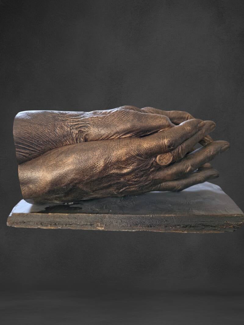 Voor deze laatste casting neem ik graag ruim de tijd. Dit moment doen we samen, in alle rust. Het kan troost bieden en een warm afscheid vormen. De mal wordt zorgvuldig afgenomen en daarna in mijn atelier gegoten in een oersterk composietmateriaal. Dit materiaal is veel duurzamer dan gips, dat vaak breekbaar is – ik kies bewust voor kwaliteit die jarenlang mooi blijft.